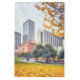 La imagen captura una escena del otoño serena en el parque de la ciudad de San Francisco. Las hojas doradas cubren el suelo, creando una alfombra vibrante. En el fondo, los rascacielos modernos se alzan contra un cielo nublado. Árboles con hojas amarillas enmarcan la esquina superior derecha de la imagen. La escena evoca una sensación de tranquilidad en medio del paisaje urbano.