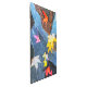 Una imagen de doble exposición captura varias coloridas hojas de otoño esparcidas en una superficie de pavimento azul con vistas al horizonte de la ciudad en segundo plano. Las hojas presentan una variedad de matices, entre ellos el rojo, el amarillo, el rosa y el blanco. El pavimento tiene una textura moteada. El ambiente general es sereno y otoñal, destacando la belleza de las hojas caídas en la ciudad.