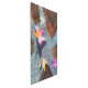 Una imagen de doble exposición captura varias coloridas hojas de otoño esparcidas en una superficie de pavimento azul con vistas al horizonte de la ciudad en segundo plano. Las hojas presentan una variedad de matices, entre ellos el rojo, el amarillo, el rosa y el blanco. El pavimento tiene una textura moteada. El ambiente general es sereno y otoñal, destacando la belleza de las hojas caídas en la ciudad.