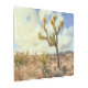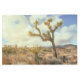 La imagen muestra un árbol Joshua de pie en un paisaje desértico bajo un cielo parcialmente nublado. El patrón de ramificación único del árbol y las hojas de araña son claramente visibles. En primer plano, la vegetación del desierto y las hierbas secas cubren el suelo. En el horizonte se ven montañas lejanas.