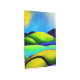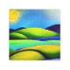 Diseño de paisaje acuático digital en tonos vivos de azul, verde y amarillo con un sol y pájaros.