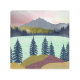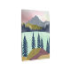 Este magnífico paisaje abstracto representa una escena montañosa con un lago y un cielo multicolor en tonos rojos, cian, azul, amarillo y oro.