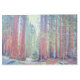 La imagen muestra un bosque denso de secuoyas gigantes, sus baúles marrones rojizos altos frente a un fondo de follaje verde. Un ligero desempolvamiento de nieve cubre el suelo y algunos de los árboles más pequeños, creando una escena de invierno serena. El suelo del bosque está cubierto de hojas caídas y rocas pequeñas. El ambiente es tranquilo y relajante, destacando la grandeza y la edad de los árboles.