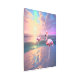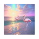 Una fantástica escena de playa con dos hermosos flamencos rosados con un hermoso sol al fondo sobre un hermoso océano tranquilo.