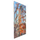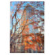 La imagen muestra una mezcla de arquitectura moderna y clásica con un fondo de follaje otoñal. Un rascacielos de vidrio alto y moderno domina la escena, con una superficie reflexiva que refleja el cielo azul claro. En primer plano, el edificio está decorado con ramas de naranja y hojas rojas vibrantes, lo que crea un contraste estacional.