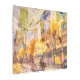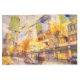 Esta imagen presenta un paisaje urbano abstracto en Seattle, con una mezcla de elementos urbanos y colores otoñales. Los edificios altos se elevan en el fondo, parcialmente oscurecidos por un overlay texturado. Árboles con hojas doradas bordean la calle, agregando calor a la escena. El grafiti adorna las partes inferiores de los edificios, contrastando con la arquitectura más formal de arriba.