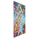 La imagen es una vibrante superposición de hojas de otoño y un paisaje urbano. Las hojas, en tonos rojos, amarillos y rosas, se superponen sobre los edificios. El fondo tiene un cielo azul con un efecto texturizado, creando una atmósfera de ensueño. Las ramas de los árboles desnudos se entrelazan con las hojas y los edificios, añadiendo profundidad a la composición. Los edificios son modernos y altos, lo que sugiere un ambiente urbano.