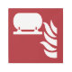 Instalación fija del extintor de incendios e icono de llama sobre fondo rojo.