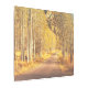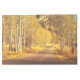 Un sinuoso camino de tierra se extiende a través de un bosque de altos y delgados álamos con hojas doradas. Los árboles bordean la carretera a ambos lados, creando un túnel de colores otoñales. La luz del sol se filtra a través de las hojas, lo que arroja un cálido resplandor en el camino. El suelo está cubierto de hojas caídas, lo que aumenta la sensación de tranquilidad y belleza.