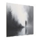 Una figura solitaria camina a través de la niebla, reflejada en la superficie de un agua silenciosa. La oscuridad de los árboles y el espeso humo evocan el misterio y la introspección, como si cada paso llevara a las profundidades desconocidas del alma.