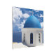 Impresión metalizado con Santorini, foto griega con cielo azul y nubes blancas.
