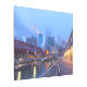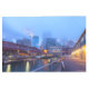 Un paisaje urbano de Seattle envuelto en una densa niebla, con el frente de agua en primer plano. Los edificios son una mezcla de rascacielos modernos y de estructuras de ladrillo antiguas, iluminadas por cálidas luces interiores que contrastan con los frescos tonos azules de la niebla. Un pontón se adentra en el agua, bordeado de restaurantes y tiendas. Un paseo bordea el paseo marítimo, iluminado por las lámparas de la calle.