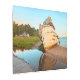 Un naufragio de madera acristalada descansa en una playa de arena, parcialmente sumergida en un arroyo poco profundo de agua. El barco se inclina hacia un ángulo que revela su casco desgastado y roto. El paisaje de los alrededores cuenta con un exuberante prado verde con una hilera de árboles en el fondo. El cielo es un azul suave con un toque de naranja del sol poniente, que arroja un cálido resplandor sobre la escena.