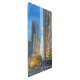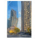 Esta imagen muestra un vibrante paisaje urbano con una arquitectura moderna en Seattle. Un llamativo rascacielos de cristal azul con un diseño geométrico único refleja los edificios y el cielo circundantes. Al lado, un edificio más alto, de color tostado, con líneas verticales de ventanas, da profundidad al paisaje urbano.