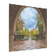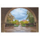La imagen muestra un patio en la Universidad de Stanford, visto a través de un arco de piedra. El patio está decorado con baldosas de piedra a cuadros, con mesas de picnic de madera y bancos repartidos por todos lados. Árboles con follaje otoñal en tonos verdes, amarillos y naranjas rodean el patio.