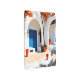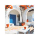 Se entra en un patio griego iluminado por el sol, decorado con un vibrante follaje naranja y puertas azules clásicas. Este lugar tranquilo capta la calidez y el encanto de la arquitectura mediterránea.