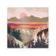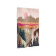 Un paisaje abstracto con colores y texturas únicos que muestran un paisaje natural con un sol naciente y dos gansos en tonos naranja, beige, marrón y rosa.