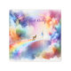 Ilustración de acuarela Te veré en el Puente del Arcoíris. Una escena caprichosa y soñadora que representa un Puente del Arcoíris colorido y etéreo que se extiende a través de un paisaje fantástico lleno de nubes suaves y onduladas en tonos vibrantes de azul, rosa y amarillo. La atmósfera es serena y mágica, evocando una sensación de asombro y tranquilidad, rodeada de estrellas brillantes y rastros de luz que realzan el encanto de la escena.