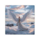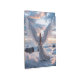 Un ángel majestuoso que domina una ciudad desde arriba, frente a un espectacular cielo atardecer. El ángel tiene el pelo dorado blanco y se extiende a lo largo de un largo período de tiempo, con enormes alas blancas de plumas que dominan la parte superior de la imagen. El ángel lleva una bata blanca que corre por el viento, y la tela atrapa la luz.