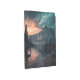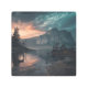 Una imagen paisajística de una pequeña cabaña de madera enclavada en un enorme acantilado rocoso gris. El camarote tiene un exterior gris y un techo metalizado inclinado, situado en la orilla rocosa de un lago tranquilo.