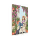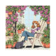 Un divertido ilustracion de historietas de una mujer sentada en su silla de césped en su patio, con su gato, una taza de café o té y rodeada de clematis morados y plantas colgantes.
