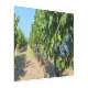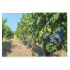 La imagen muestra un viñedo con hileras de viñas de uva cargadas de uvas maduras y azul oscuro. Las hojas verdes cubren las viñas, creando un toldo exuberante. El suelo está seco y polvoriento, con un cielo azul claro visible por encima. La perspectiva lleva el ojo a las hileras de viñas, sugiriendo un vasto viñedo. Una tubería de riego negra recorre la base de las viñas.