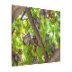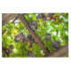 La imagen muestra una vista de los racimos de uva colgados de una vid, sostenidos por un enrejado de madera. Las uvas son una mezcla de verde y púrpura, lo que indica diferentes etapas de maduración. Hojas verdes exuberantes rodean las uvas, creando un denso dosel. La estructura de madera es de vigas gruesas, con un ambiente rústico y natural.