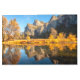 Una fotografía panorámica del paisaje capta el valle de Yosemite en otoño. El río Merced refleja los imponentes acantilados de granito y el follaje dorado. Árboles con hojas amarillas bordean la orilla del río, contrastando con el cielo azul claro. El reflejo en el agua crea un espejo de las montañas y los árboles. En general, el ambiente es tranquilo y sereno, lo que demuestra la belleza natural del parque.