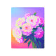 This piece is a modern take on impressionism, capturing a lush bouquet of peonies or roses in a vibrant "neon pastel" palette of hot pinks, sunny yellows, and cool purples. The art has a rich, textured, digital-painting feel.