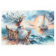 An ethereal watercolor seascape capturing a quiet moment where ocean and soul meet. A graceful woman sits upon a weathered dock, her floral-crowned hair drifting in the breeze as a sailboat glides toward the glowing horizon. Soft indigo and coral tones mingle with drifting clouds, creating a tranquil balance of light and sea. This romantic coastal vision evokes reflection, freedom, and the timeless pull of distant shores. AI generated artwork.