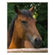 Un gran caballo marrón sube a una valla de cedro y posa para un retrato.