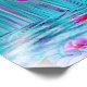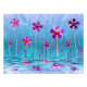 Dibujo digital de flores moradas lindas y estilizadas con brillantes centros rojos. Te miran curiosamente desde la hierba alta junto a una piscina de agua transparente.