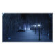 Un sendero cubierto de nieve que serpentea por el bosque de abedules en una noche de invierno oscura. El camino está bordeado de farolas que desprenden un resplandor azul plateado, pero en las sombras hay formas luminosas e hipnotizadoras como pequeñas luces de hadas que atraen al viajero fuera del camino. A la distancia, el brillo de lavanda de una misteriosa reunión forestal ilumina el frío cielo.