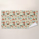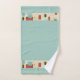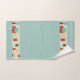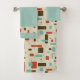 Este conjunto de toallas de baño tiene un aspecto de mediados de siglo con un diseño gráfico en cuadrados y rectángulos geométricos. Los colores son el azul cielo, el óxido y el marrón. Algunos de los bloques son de colores sólidos y algunos contornos. La toalla de mano es azul sólido con un borde del diseño gráfico. El paño de lavado es azul sólido. El estilo moderno de mediados de siglo es popular entre 1950 y 1969. Es hacer un regreso a la popularidad hoy.
