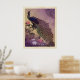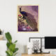 Pavo real con estampado botánico asiático en peonías rosadas sobre damasco de oro y púrpura, con marco ornamental de hierro barroco. Adaptado de una antigua impresión japonesa vintage. Huella de arte botánico vintage.