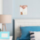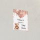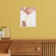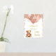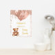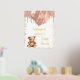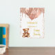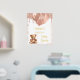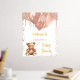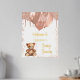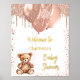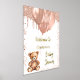 Un poster de bienvenida para una ducha infantil elegante y moderna. Un fondo blanco, un oso de peluche sostiene globos de color oro rosa. Personalice y agregue un nombre. Texto: Relieve metalizado de oro real.