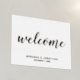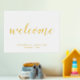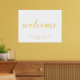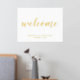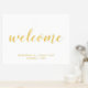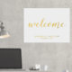 Signo de bienvenida de Boda blanco y dorado con guión moderno con el título "Bienvenidos" en Relieve metalizado oro real tipo escritura moderna con detalles en oro real oro moderno sans serif tipo de letra sobre fondo blanco.