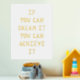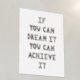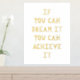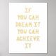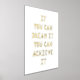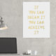 Perfecto para una habitación de niños, esta impresión de arte muestra el inspirador mensaje "Si puedes soñarlo, puedes lograrlo" escrito con letras juguetonas, dibujadas a mano e impreso en Relieve metalizado dorado o plateado. El fondo blanco se puede dejar tal cual, o el cliente puede cambiarlo a un color que se ajuste mejor a sus necesidades.