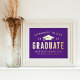 Moderno poster de graduación con atrevidas letras de Relieve metalizado dorado con fondo morado. El diseño presenta una tapa de graduación de Relieve metalizado dorado con la frase "Felicitaciones a nuestro graduado". Personalice el cartel de graduación de Relieve metalizado morado y dorado agregando el nombre del graduado, el nombre de la escuela y el año de graduación. Para obtener un aspecto más personalizado, cambie el fondo a los colores de la escuela. ¡El poster de graduación de Relieve metalizado es perfecto para tu fiesta de bachillerato o de universidad!