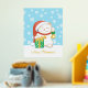 Un gato blanco sonriente en un gorra tradicional de Navidades rojos con un gran regalo envuelto le desea a todos una Feliz Navidad! En su pata izquierda, el gato está sosteniendo una campana dorada con una proa verde.