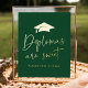 Cartel moderno de la fiesta de graduación con el ilustracion de un gorro de graduación de Relieve metalizado dorado en la parte superior con "Los diplomas son dulces" en un guión de Relieve metalizado dorado escrito a mano sobre un fondo verde. Personalice el signo de graduación de Relieve metalizado verde y dorado con su texto personalizado (actualmente se muestra con "por favor tómate un regalo"). El cartel de la fiesta de graduación de Relieve metalizado es perfecto para mostrarse en una mesa con postre o dulces que favorecen a los huéspedes.