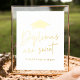 Cartel moderno de la fiesta de graduación con el ilustracion de una gorra de graduación de Relieve metalizado dorado en la parte superior con "Los diplomas son dulces" en un guión de Relieve metalizado dorado escrito a mano. Personalice el signo de graduación del Relieve metalizado de oro con su texto personalizado (actualmente se muestra con "por favor tómate un tratamiento"). El cartel de la fiesta de graduación de Relieve metalizado es perfecto para mostrarse en una mesa con postre o dulces que favorecen a los huéspedes.