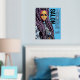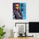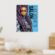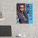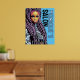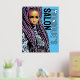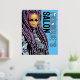Decore su peluquería con este elegante poster de color morado y azul, con su nombre de negocio en Relieve metalizado metálico llamativo. Creado para especialistas étnicos en peinado, el retrato artístico muestra a una mujer negra feroz y hermosa con largas y gruesas trenzas.