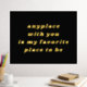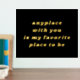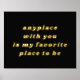 Esta moderna impresión de arte de Relieve metalizado presenta un fondo negro con una tipografía simple que dice "cualquier lugar con usted es mi lugar favorito para ser" en Relieve metalizado dorado. El color de fondo es completamente personalizable y se puede elegir entre Relieve metalizado dorado o plateado elevado. El texto también es editable. Hace un regalo maravilloso para tu novia y es una forma divertida de mejorar tu decoración de pared.