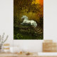 Un bello unicornio blanco yace bajo un árbol forestal para descansar entre las flores.