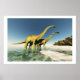 Dos dinosaurios Diplodocumentes recorren las aguas poco profundas para llegar a una isla con vegetación.