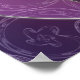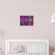 Un diseño de vidrio teñido de espirales de plata y tonos de ciruela, sobre un telón de fondo repetido de fractales de espiral. Las espirales de plata convergen en un diseño rosa plateado, con gemas redondas para acentos.
