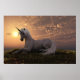 Un hermoso unicornio descansa en la puesta de sol de la tarde.