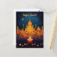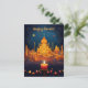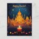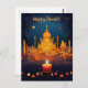 Asombrosa postal de Diwali con vista nocturna de un templo y texto personalizado en el medio en tonos amarillos y naranjas sobre fondo oscuro