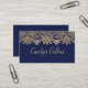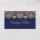 Bonita tarjeta de visita de diseño, de color azul marino, con gráficos de color dorado y de encaje, en la parte delantera de la tarjeta. Personalice el texto para adaptarlo a sus necesidades empresariales. Una preciosa carta destacable para ella.